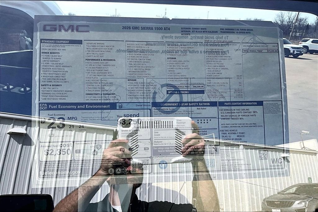 Summit White 2026 GMC Sierra 1500 3.0L I6 10-Speed Automatic 4WD AT4 10-Speed Automatic, 4WD, Jet Black With Kalahari Accents Leather.
