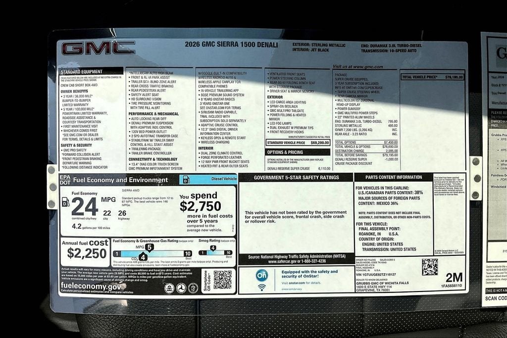 Sterling Metallic 2026 GMC Sierra 1500 3.0L I6 10-Speed Automatic 4WD Denali New Feature 3, New Feature 4, 10-Speed Automatic, 4WD, Jet Black Leather, 120-Volt Bed Mounted Power Outlet, 120-Volt Interior Power Outlet, 170 Amp Alternator, 2 Charge/Data USB Ports Inside Center Console, 2 Type-C Charge-Only Rear USB Ports, 2 USB Ports, 7 Speakers, AM/FM radio: SiriusXM with 360L, Auto-Locking Rear Differential, Auxiliary External Transmission Oil Cooler, Bed View Camera, Chrome Recovery Hooks, Color-Keyed Carpeting Floor Covering, Deep-Tinted Glass, Denali Reserve Super Package, Electric Rear-Window Defogger, Floor-Mounted Center Console, Front Rain-Sensing Wipers, GMC MultiPro Power Steps, HD Surround Vision, Heated 2nd Row Outboard Seats, Heavy-Duty Air Filter, Hill Descent Control, Hitch Guidance, Hitch View, Integrated Trailer Brake Controller, LED Cargo Area Lighting, Multicolor 15 Diagonal Head-Up Display, Navigation System, OnStar Services Capable, Perimeter Lighting, Power Door Locks, Power Sunroof, Preferred Equipment Group 5SA, Premium Bose 7-Speaker Sound System, Push Button Start, Radio data system, Radio: Premium GMC Infotainment Audio System, Rear Camera Mirror, Rear Cross Traffic Braking, Rear Pedestrian Detection, Rear Wheelhouse Liners, Remote Vehicle Starter System, Steering Wheel Audio Controls, Super Cruise, Super Cruise Wrapped Steering Wheel, Technology Package, Trailer Camera Provisions, Trailer Side Blind Zone Alert, Trailering Package, Universal Home Remote, Wheels: 22 x 9 Painted Aluminum, Wi-Fi Hotspot Capable, Wireless Apple CarPlay/Wireless Android Auto, Wireless Charging.