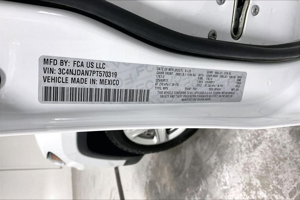 2023 Jeep Compass Sport Sport Bright White Clearcoat 4D Sport Utility 4WD 2.0L I4 DOHC 8-Speed Automatic New Feature, Backup camera, Bluetooth®, Compass Sport, 4D Sport Utility, 2.0L I4 DOHC, 8-Speed Automatic, 4WD, Bright White Clearcoat, Black Cloth, 17 x 7.0 Aluminum Wheels, 3.73 Final Drive Ratio, 4-Wheel Disc Brakes, 6 Speakers, ABS brakes, Air Conditioning, Alloy wheels, AM/FM radio: SiriusXM, Brake assist, Bumpers: body-color, Cloth Low-Back Bucket Seats, Compass, Delay-off headlights, Driver door bin, Driver vanity mirror, Dual front impact airbags, Dual front side impact airbags, Electronic Stability Control, Four wheel independent suspension, Front anti-roll bar, Front Bucket Seats, Front Center Armrest w/Storage, Front License Plate Bracket, Front reading lights, Fully automatic headlights, Heated door mirrors, Illuminated entry, Knee airbag, Low tire pressure warning, Occupant sensing airbag, Outside temperature display, Overhead airbag, Overhead console, Panic alarm, ParkView Rear Back-Up Camera, Passenger door bin, Passenger vanity mirror, Power door mirrors, Power steering, Power windows, Quick Order Package 29A, Radio: Uconnect 5 w/10.1 Display, Rear anti-roll bar, Rear seat center armrest, Rear window defroster, Rear window wiper, Remote keyless entry, Security system, Speed control, Split folding rear seat, Spoiler, Steering wheel mounted audio controls, Tachometer, Telescoping steering wheel, Tilt steering wheel, Traction control, Trip computer, Variably intermittent wipers.